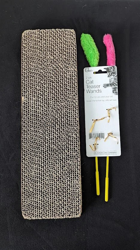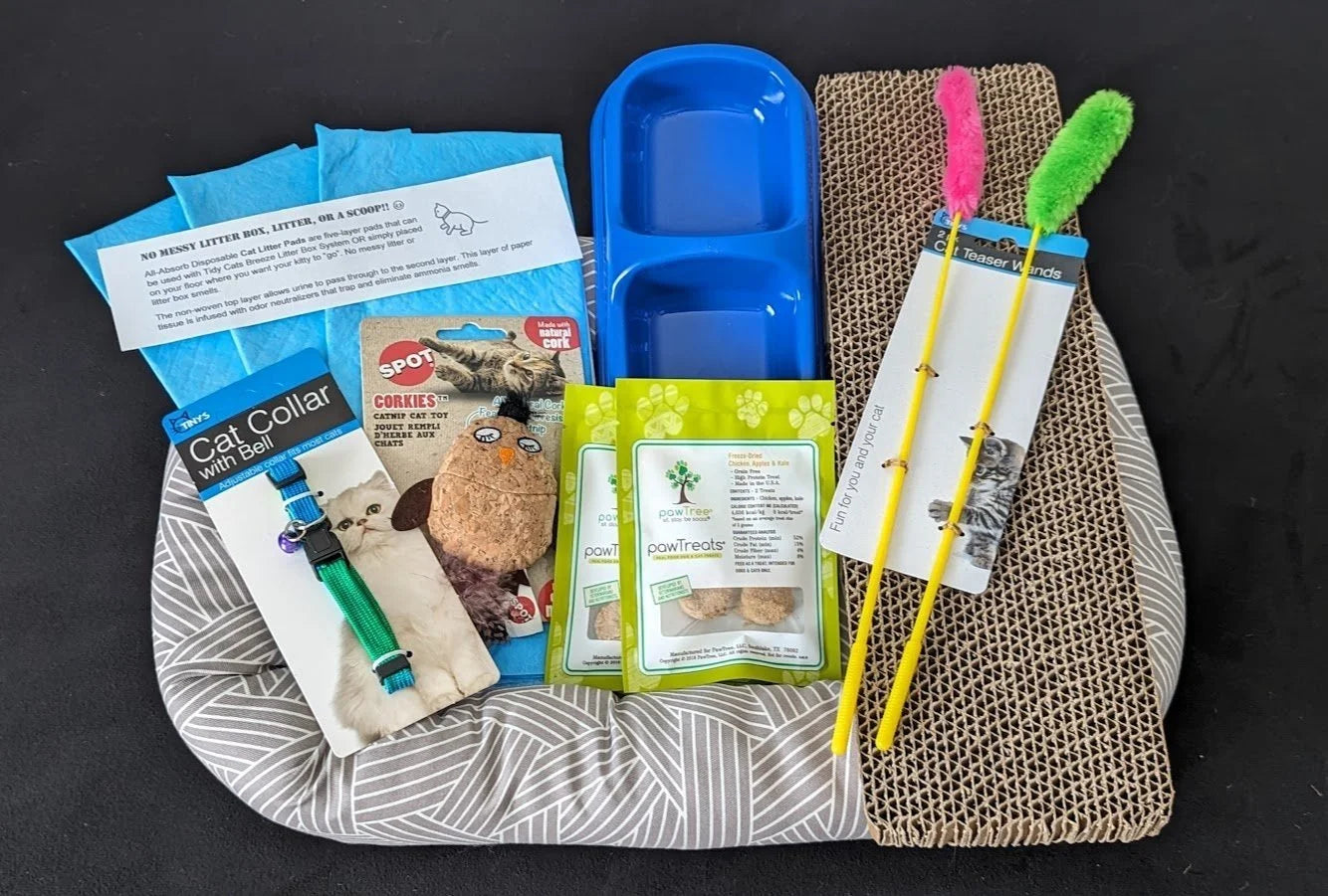Your kit includes the following essential items: An 18x12 bed, food/water dish, a single scratch board, a collar with a bell, three (3) 17x12 disposable kitty litter pads (no messy litter, box or scoop!), a cat nip toy, a teaser wand toy, and a little something for the fur baby parent. Update: We no longer include the pawTreat samples in this kit.