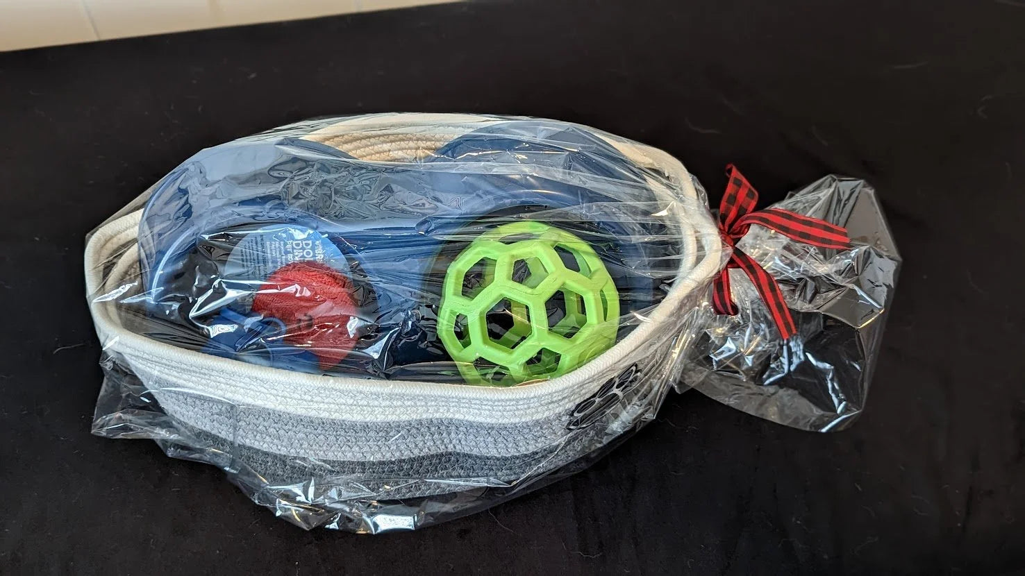 Welcome Home kit includes: A toy/storage basket, double food dish, chew toys, 6 ft. leash, treat ball, happy face collar, grooming brush, and a poop bag dispenser - with bags.