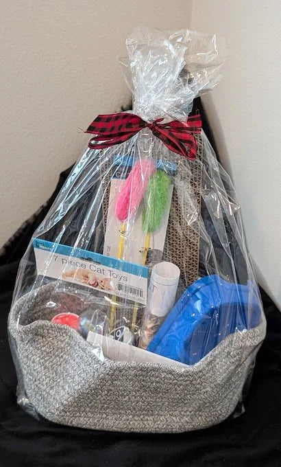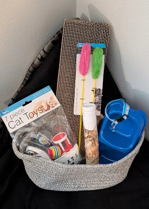 Welcome Home kit includes: A toy/storage basket, double food dish, variety bag of toys, wand toy, a scratcher and a break-free collar with bell.